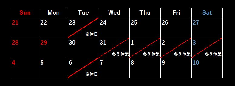 2025.12.10 2025年~2026年 営業日のご案内 カテゴリー: ★おしらせ★★ご案内★★日記★ 末年始休業のお知らせ 平素は格別のご愛顧を賜り厚くお礼申し上げます。 誠に勝手ながら12月31日(水)から翌年1月3日(土)まで お休みとさせて頂き、翌4日(日)より営業とさせて頂きます。 ご迷惑をお掛け致しますが何卒宜しくお願い申し上げます。
